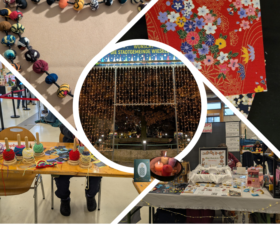 Fast nahtlos sind wir dann vom Convention-Trubel in den Adventmarkt in Wieselburg hinübergerutscht – ein richtiges Lichterfest. Im Schlosspark und im Amtshaus gab es wieder den Kunsthandwerksmarkt mit vielen Ständen, immer mit dem Fokus auf Handwerk: gemalte Bilder, handgestrickte Mützen, gestickte Karten, Häkelnadeln mit Holzgriffen, Holztaschen – und das ist nur ein kleiner Ausschnitt.